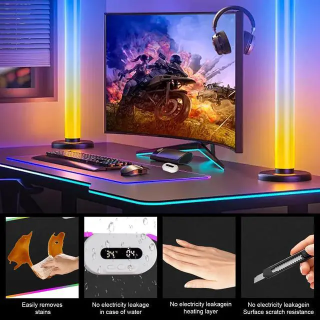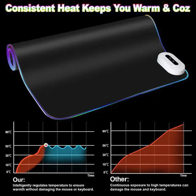 LED LightingMeasuring 31.5 inches × 15.7 inches, this heated mouse pad perfectly accommodates keyboard and mouse setups. Perimeter LED light strips extend usage time while creating a vibrant ambiance that enhances work and gaming moods. It's not only the ideal winter desk accessory but also a thoughtful gift for friends and family.