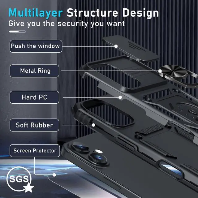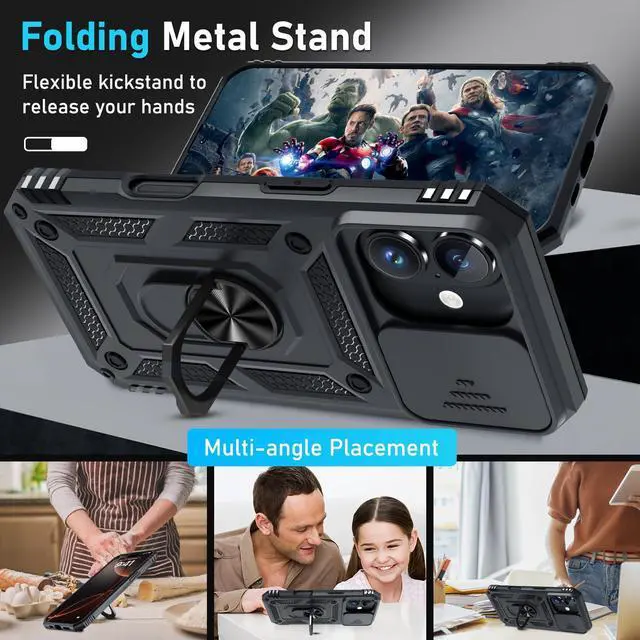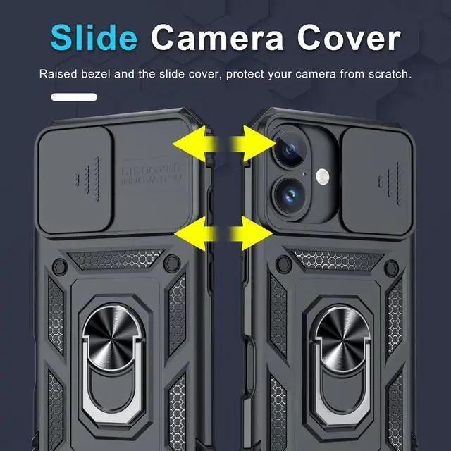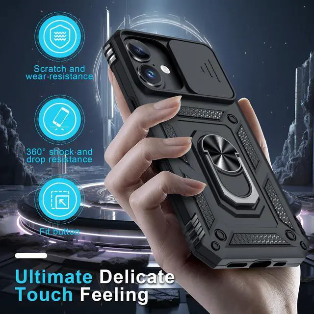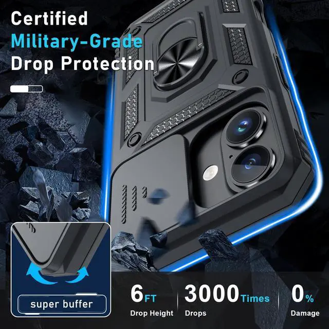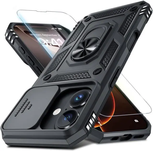 Case for iPhone 14 & iPhone 13 Phone Cover Built in Slide Camera Lens Cover+Screen Protector, Heavy Duty Shockproof Full Body PhoneCase with Finger Ring Holder Kickstand, Black