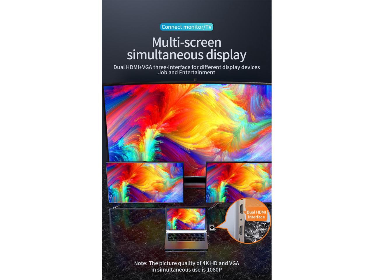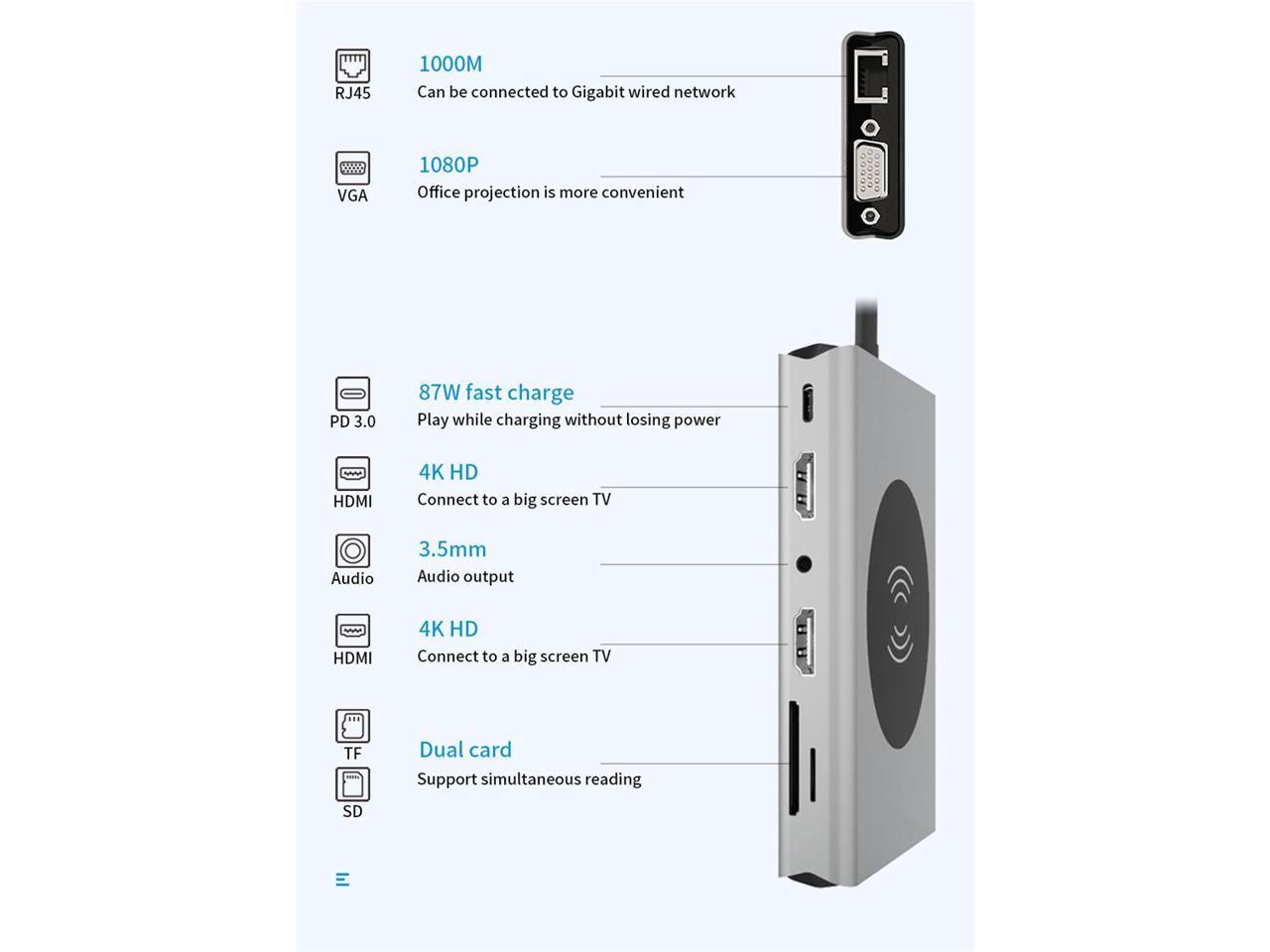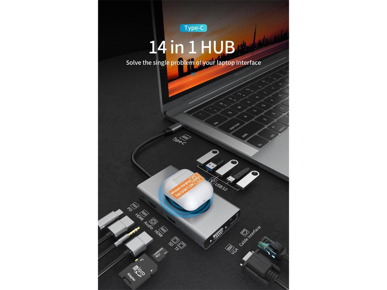 14-IN-1 USB C DOCKING STATION: This USB C multiport adapter has everything you need to expand your Type C computer or device. Cast your screen with HD HDMI and VGA ports, import photos with SD/MicroSD card readers, listen to audio, connect to your network with Ethernet, and plug in up to 5 USB 3.0 devices.