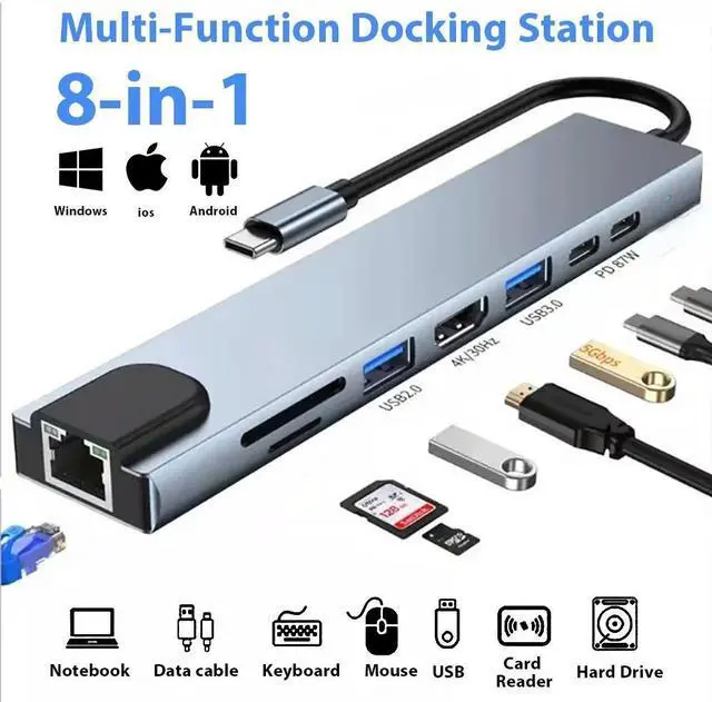 Introducing the USB C Hub Docking Station - the ultimate solution to expanding your laptop or MacBook Pro or MacBook Air's connectivity options effortlessly. With an impressive array of features packed into a compact and sleek design, this 8-in-1 Type C Hub USB C Dongle will revolutionize the way you use your laptop. First and foremost, this versatile docking station is equipped with an HDMI port that supports stunning 4K resolution at an impressive 60Hz. Whether you're presenting a slideshow, watching a movie, or editing videos, you can now enjoy crystal-clear images with remarkable clarity and vibrant colors on your external display.