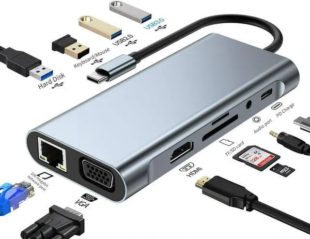 - Manage All in One USB-C Hub: The USB C Hub Adapter is compatible with all devices that contain Type-C / USB ports, especially MacBook Pro and Air. 11-in-1 USB C-HUB includes one USB3.0 and three USB2.0 ports, a PD port, a 4K HDMI video output, a VGA male-to-female port, an RJ45 Ethernet port and one Audio output, and SD / Micro SD card reader slots, compatible with MacBook Pro / Air, Chromebook and other Type-C devices.