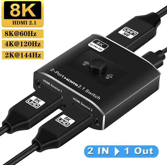 HDMI 2.1 Switch 2 in 1 out--- Premium Aluminum alloy HDMI switch 2x1 easily streams video and audio from 2 different HDMI sources to 1 HDMI display, No lag, NO flash or drop in resolution. Release you from the plugging and unplugging HDMI cables, easily enjoy work time and playtime via switching between 2 devices with one button.