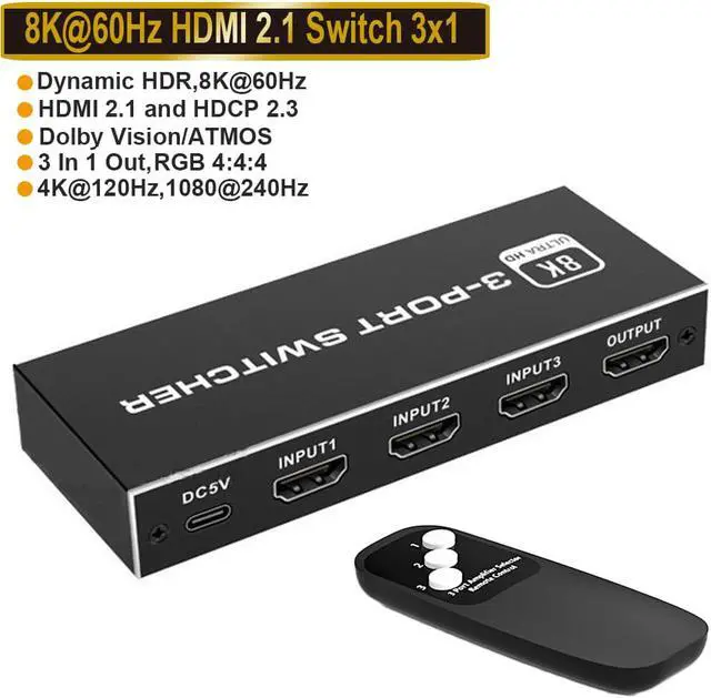 - 8K @60Hz HDMI Switch: 3 Port HDMI switch output resolution up to 8K@60Hz also compatible with 4K@60Hz, 1080P@240Hz,1080P@144Hz, and 4k@120Hz. Transfer rate up to 48Gbps. (NOTE: If you need to output 8K@60Hz, recommend to use a high-quality HDMI 2.1 cable and length not excess 10ft.)