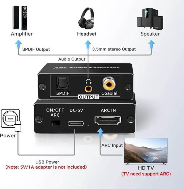 2.0ch/5.0CH Extractor: Input: HDMI ARC, Output: 3.5mm Jack,Toslink/SPDIF and Coaxial.Supports PCM5.1 / LPCM 2.0 Channel, HDMI ARC Input to 2.0CH 3.5mm jack or Optical/Coaxial 5.1 Output Headphone Output; Just Plug and Play