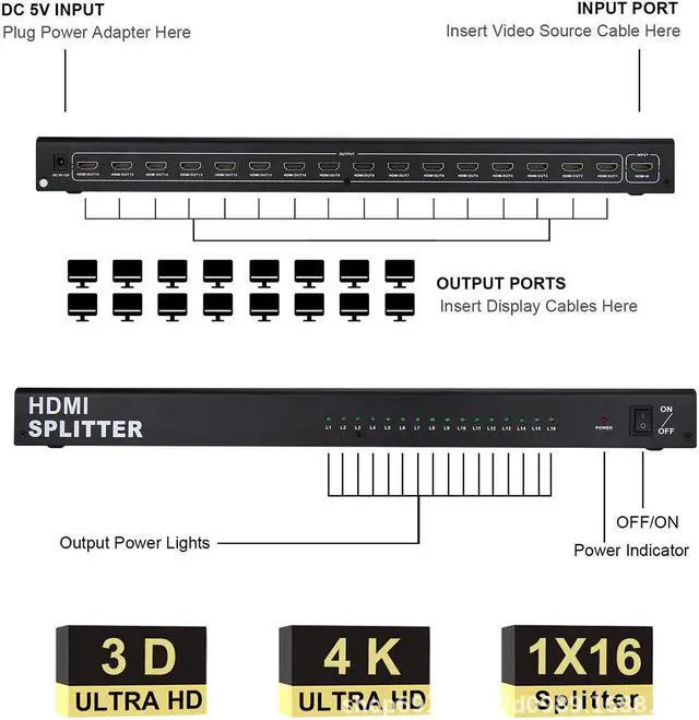 Please Note: This is 1 in 16 out hdmi splitter, not 16 in 1 out hdmi switch, it can't extend 16 different screens.