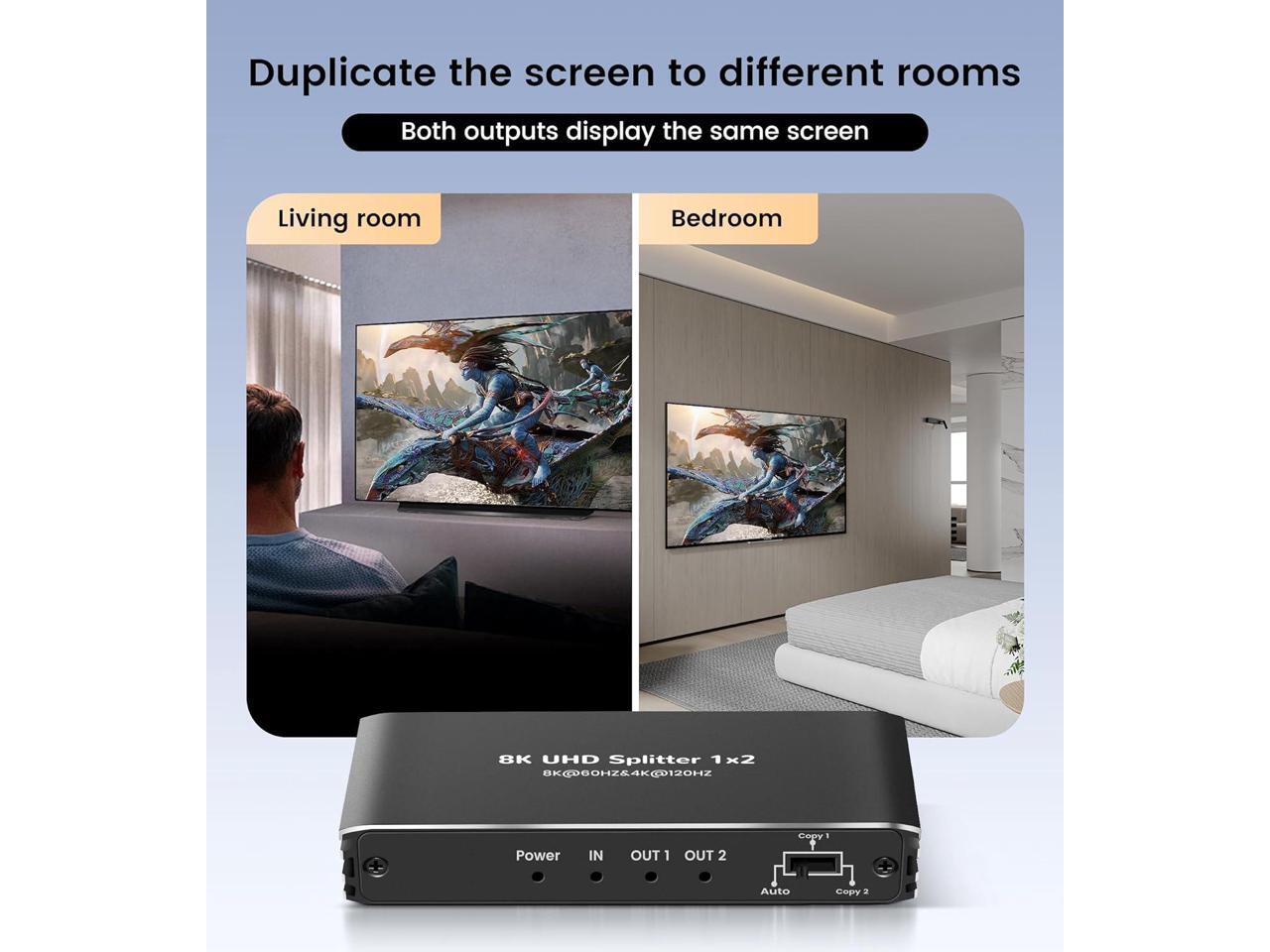 - HDMI 2.1 Splitter 1 in 2 out can easily duplicate/mirror 1 HDMI source to 2 displays simultaneously. Supports HDCP 2.3 bypass 4K 120HZ 8K 120Hz VRR ALLM Dobly Atmos Dobly Visinon.Comes with EDID management, Down scaler function.
