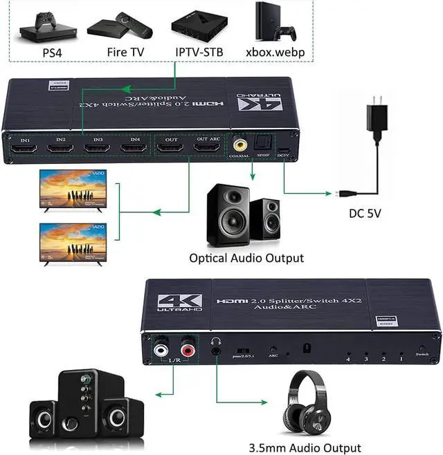 4 in 2 Out 4K HDMI Switch Audio Extractor, 4K@60Hz ARC Auto Switch EDID HDMI 2.0, 6Gbps, HDCP 2.2, HDR, Dolby Vision, ARC for PS4 Xbox Apple TV Fire Stick Blu-Ray Player