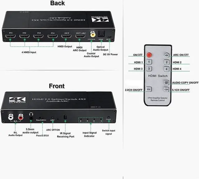 HDMI 2.0 and HDCP 1.4,4K@60Hz 4X2 HDMI Switch audio extractor with ARC,3.5mm Jack,L/R,Coaxial & optical Toslink SPDIF.support YUV4:2:0 for 4K@60Hz,EDID,IR remote control,HDR for 2K .