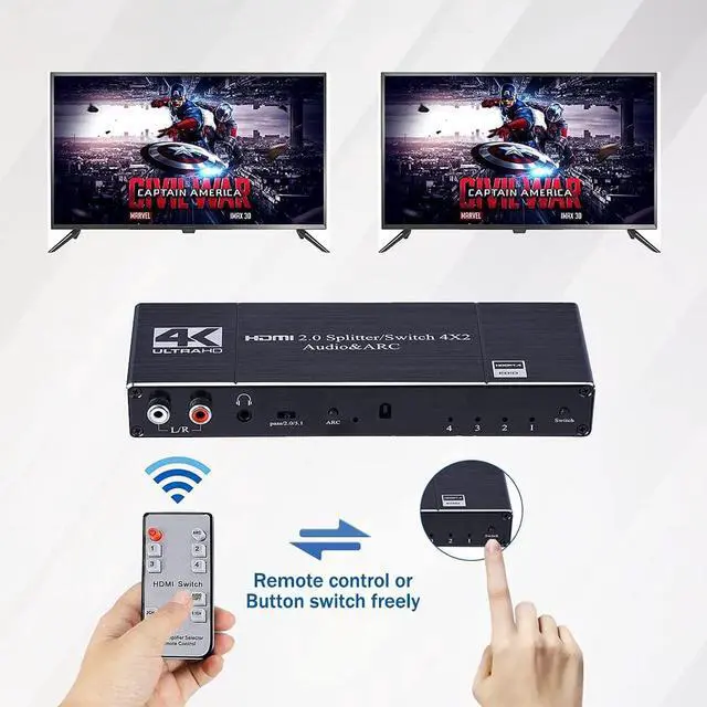 HDMI Switch 4x2: The 4x2 HDMI 2.0 switch splitter can connect 4 hdmi input signal sources to 2 hdmi output display terminals. It can easily Switch the 4 HDMI input signals to 2 HDMI output siganl. (Please