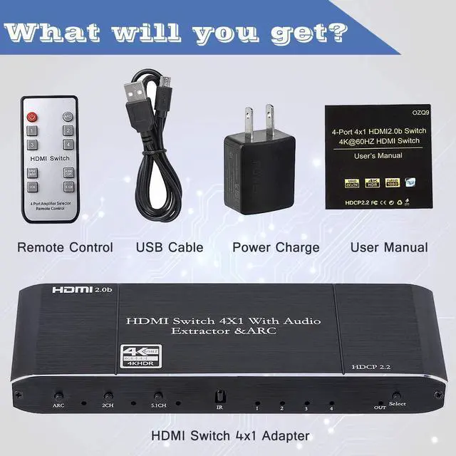 - There are 4 ports HDMI input,1 port HDMI output with ARC function, Toslink output, Coaxial Output, 3.5mm Jack output.