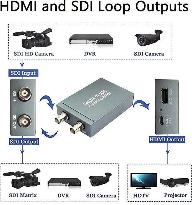 SDI to HDMI Converter Designed for SDI to HDMI Converter allows you easily display your work on common HDMI displays. The loop-through design also allows you to view the original SDI content on an SDI monitor simultaneous with the HDMI display. This converter supports bit rates up to 2.970 Gbps and supports SD-SDI, HD-SDI, and 3G-SDI video signals