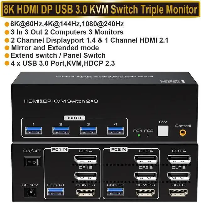 - KVM Switch Triple Monitor Ultra HD 8K@60Hz: The HDMI 2.1 and DP 1.4 KVM Switcher supports resolution up to 8K@60Hz 4K@120Hz and downwards. High-definition resolution makes the picture quality clearer, and the details are displayed clearly and finely. Note: that you can only get 8K, if both your computer's graphics card and monitor support 8K.