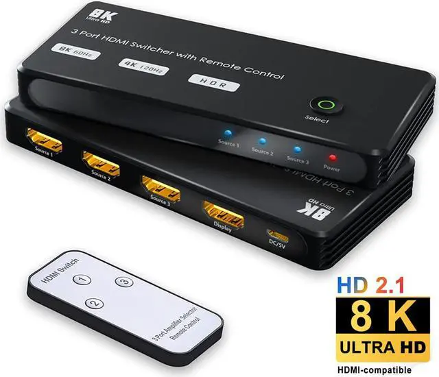 8K@60Hz HDMI 2.1 Switch 3 In 1 Out With Remote control, can easily stream video and audio from 3 HDMI devices to 1 HDMI display.