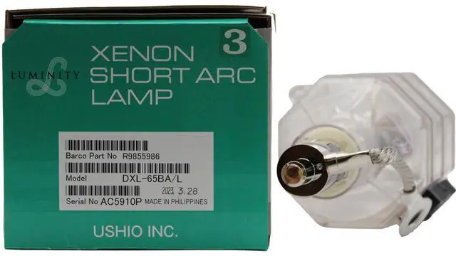 This Ushio DXL-65BA3 / 5002570 Digital Cinema Xenon projector lamp is also knows as the Barco R9855985 and works with the following