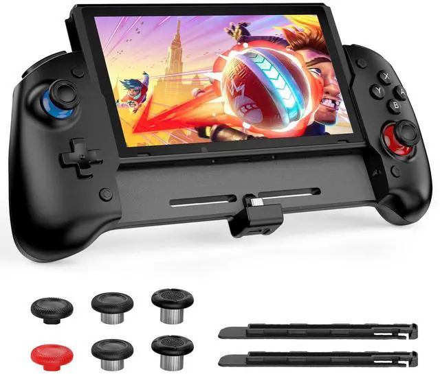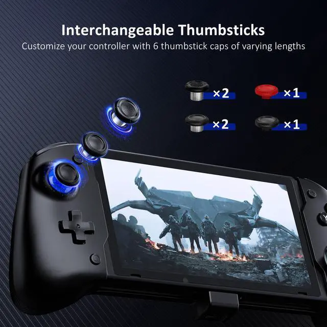 Experience ultimate comfort and precision gaming with the JAYSUING Gripcon Ergonomic Controller, designed for handheld mode. It features advanced hall sensors to eliminate drift, a six-axis gyro for motion sensitivity, and customizable, swappable caps for optimal comfort and versatility. Compatible with both Switch and Switch OLED consoles.