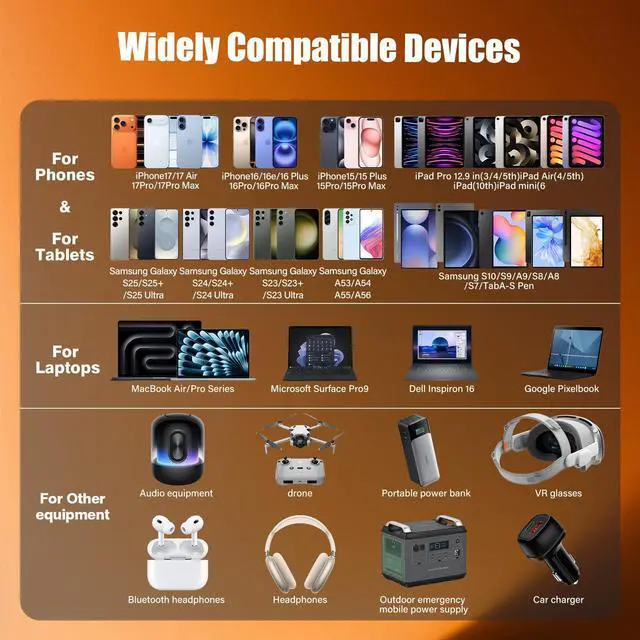 | Compatible Devices | for iPhone Air 17 16e 16 15 Pro Plus Pro Maxfor iPad Pro, for iPad Air, for iPad Mini ,for MacBook Pro, for Macbook Air , for Galaxy S25/24/S23/S22/S21, for Galaxy A56/A55/A54/A53,for Galaxy Z Flip7 FE, for Galaxy Z Fold7/6/5,for Galaxy Z Flip7/6/5,for Galaxy W25/W24/W23, for Google Pixel 10/9/8/7/6/5/4/3for Switch, for PS5 and other USB-C port devices |