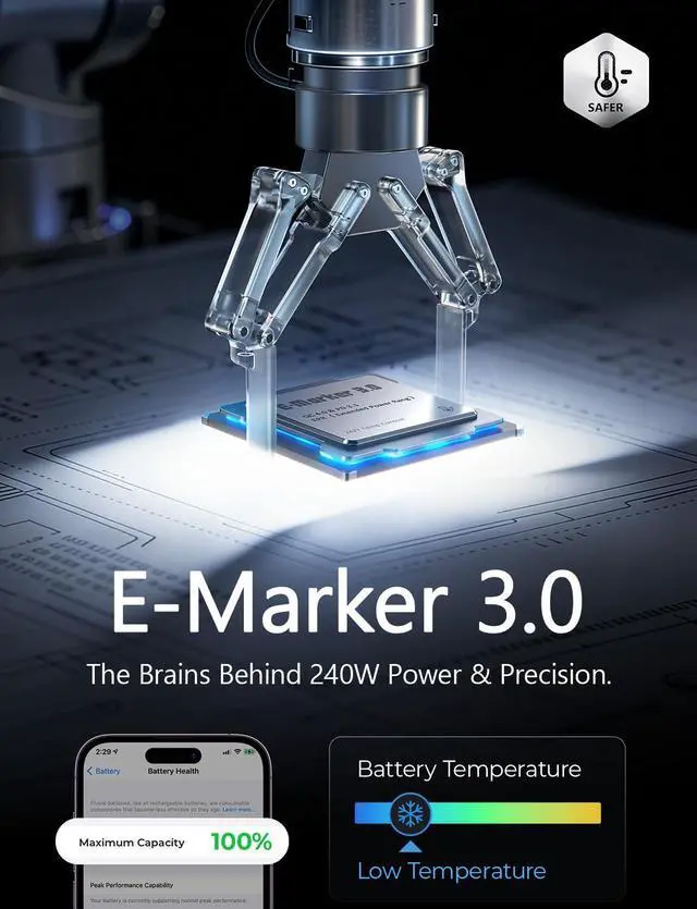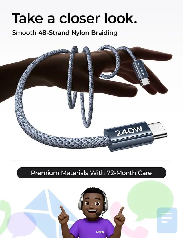 "Unlock the full potential of your devices with the 240W USB-C fast charging cable. Leveraging advanced PD3.1 EPR technology, it intelligently delivers the fastest safe charge for your MacBook Pro, iPad, iPhone 17, and other devices. Its integrated E-Marker 3.0 chip ensures ultimate safety with real-time monitoring, while the premium oxygen-free copper core guarantees stable, high-speed power delivery and data sync. Wrapped in military-grade nylon, this C to C cable fast charging is built to withstand over 40,000 bends for exceptional durability. Backed by a 72-month warranty, this usb c to usb c cable is the smarter, safer, and more powerful charging solution you can trust. Experience unparalleled charging convenience with this high speed long usb c cable 6ft, an essential iPhone 17 pro max accessories for home, office, or travel. This robust usbc to c cable is engineered for exceptional versatility, serving as a reliable iPhone 17 charger cord for your phone and a powerful type c charger fast charging for your USB-C laptops and tablets. Beyond rapid power delivery, this usb-c to usb-c cable supports high-speed 480Mbps data syncing, making file transfers between devices quick and effortless. Designed for daily durability and a tangle-free experience, this type c cable features a flexible yet sturdy build that resists kinks. A must-have fast charging usb-c cables for all your tech needs, this fast charging cord type c delivers both superior performance and broad compatibility, ensuring all your devices stay powered."