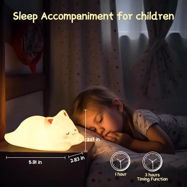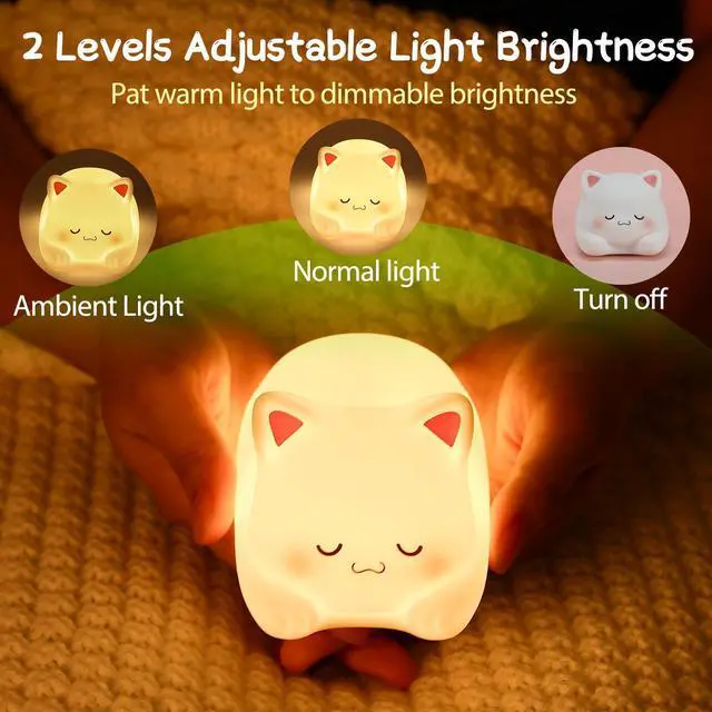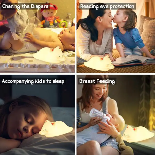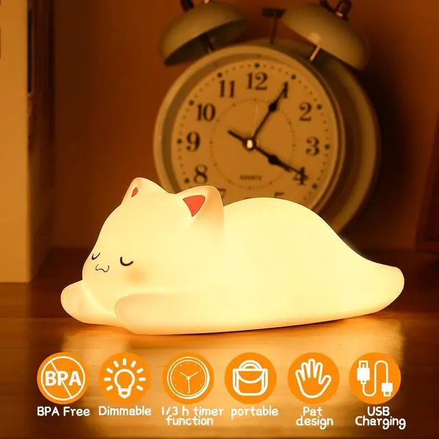 JAYSUING Cat Night Light, Cute Cat Nursery Lights USB Rechargeable Cat Lamp Nightlight Birthday Christmas Gift with Warm White and 7-Color Breathing Modes for Kids Baby Children