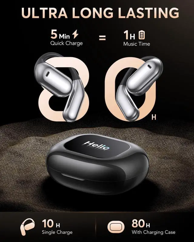 Experience a new era of sound freedom with the open ear headphones designed for all-day comfort and total awareness. Their ergonomic, pressure-free design rests gently on your ears, keeping you connected to the world while enjoying your favorite music, podcasts, or calls. Whether youre running, cycling, or working, the IP68 waterproof protection and secure fit ensure reliable performance in any weather. The charging case features a vivid full-color LED touch screen, offering smart control at your fingertips. Check battery life, switch modes, adjust volume, or activate AI voice assistant with a single tap. The intuitive interface redefines convenience, blending futuristic style with smart interaction. Power through every moment with 80 hours of total playtime and 5-minute quick charge technology that delivers 1 hour of music on the go. The efficient wireless charging case keeps your sound powered from morning to night, making it ideal for travel, workouts, or daily commutes. Enjoy immersive, leak-free audio powered by a 15mm dynamic driver and bone conduction technology. Every beat is crisp, natural, and balanced, allowing you to stay aware of your surroundings while diving into vivid, lifelike sound. With upgraded Bluetooth 5.4, enjoy ultra-low latency, seamless connection, and enhanced energy efficiency up to 15 meters. Whether streaming, gaming, or calling, the around the ear wireless earbuds provide stable, clear, and effortless connectivity anywhere life takes you.