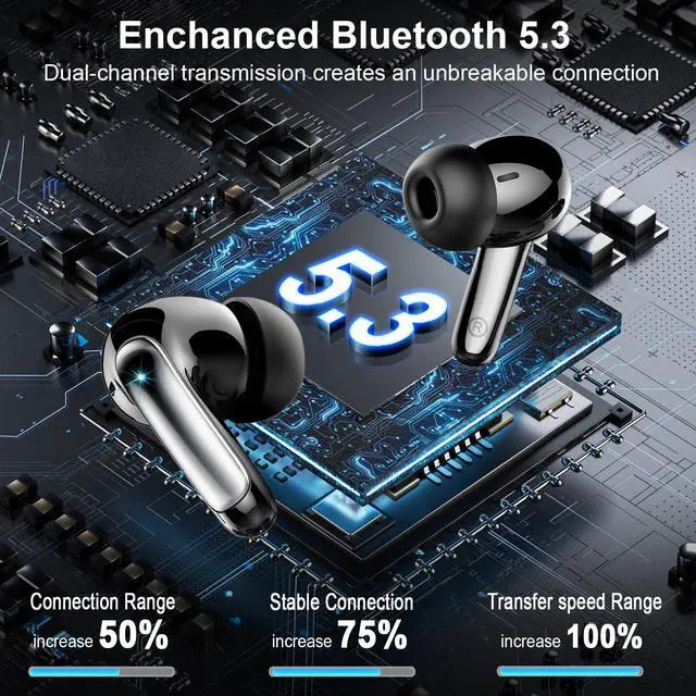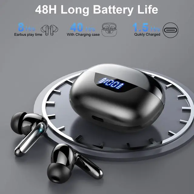 Wireless Earbuds, Bluetooth 5.3 Headphones Bass Stereo, 48Hours Playtime, 4 ENC Mic Clear Calls, Noise Cancelling Ear Buds with LED Display Charging Case,IPX7 Waterproof Earphone for Android iOS Black