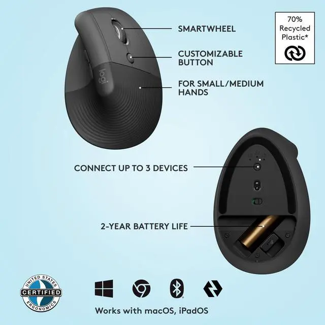 Lift Vertical Ergonomic Mouse Desk life getting you down? Lift yourself up with the Vertical Mouse a comfy and intuitive wireless mouse for PC and Mac crafted specially for small to medium hands. Available in right and left configurations, this ergonomic mouse features a unique 57-degree angle that elevates your wrist for ergonomic comfort & design, bringing relief to your forearm and upper body. Scrolling feels natural with SmartWheel, offering precision and speed-scroll. Customize your ergonomic Bluetooth mouse with Logi Options+ Software, easily assigning each of the 4 customisable buttons to handy shortcuts as you switch between apps.* Connect with up to 3 devices, using Easy-Switch to toggle between them at the click of a button. Utilize Flow to move across screens and transfer files with simple commands.* This vertical mouse wireless is multi-OS compatible (Windows, macOS, iPadOS, Chrome OS**, Linux**) and boasts two years of battery life from a single AA***. Product Details: Weight: 125 g; Dimensions: 108 x 70 x 71 mm; Tracking: 4000 DPI (fully adjustable); Battery type: 1x AA; Battery life: 24 months***; Wireless range: 10 m; Connectivity: Bluetooth wireless mouse or Logi Bolt USB receiver; Platform compatibility: Windows 10, 11 or later, macOS 10.15 or later, iPadOS 14 or later, Chrome OS, Linux, Android 8.0 or later**. The ergonomic mouse ensures seamless functionality on your laptop mouse wireless, USB mouse wireless, or wireless computer mouse needs. *Requires Logi Options+ software, available for Windows and macOS. **Basic functions supported without additional drivers for non-Windows and macOS systems. ***Battery life may vary based on user and computing conditions.
