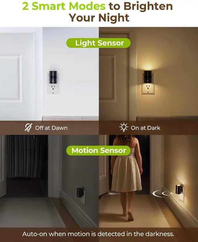 The tube night lights feature an AUTO mode. When motion is sensed in low light, the motion sensor night light automatically turns on and shuts off after 60 seconds of inactivity. In NIGHT mode, the LED night light has a dusk-to-dawn sensor to detect ambient light, turning on automatically in darkness and off at dawn or in bright conditions
