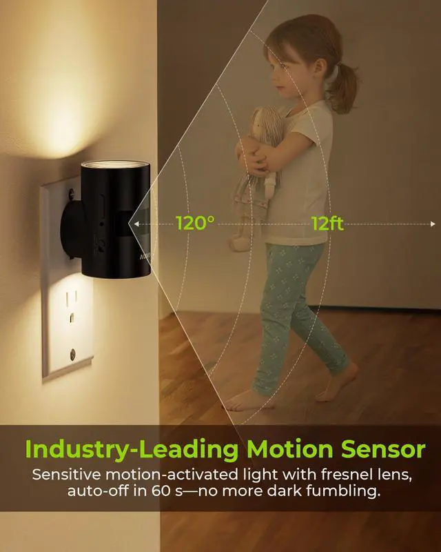 Adopting the Fresnel lens, the night light can detect motion within 3-5 meters at a 120° angle