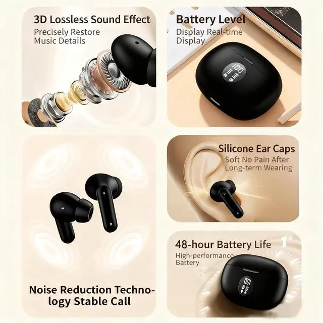 Experience premium wireless audio with these advanced Bluetooth 5.3 earbuds. Featuring 3D lossless sound effect technology, these in-ear headphones deliver precisely restored music details and crystal-clear calls without delay. The comfortable silicone ear caps are designed for long-term wearing, ensuring a secure fit during workouts or daily activities. With an impressive 48-hour battery life from the high-performance battery and real-time LED display showing battery levels, you'll always know when it's time to recharge. The built-in noise reduction technology ensures stable, uninterrupted calls whether you're running, working out, or relaxing. Perfect for fitness enthusiasts and professionals alike, these versatile earbuds seamlessly transition from intense workout sessions to important video calls. The high-definition audio quality maintains perfect synchronization across all your activities, from listening to music and gaming to making calls. Their sleek black design combines style with functionality, making them an ideal companion for your active lifestyle.