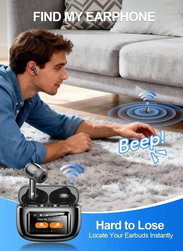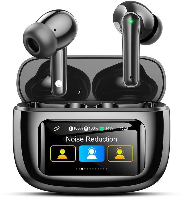 Innovative Touchscreen Charging Case: Manage your audio easily. The case display shows battery levels and allows