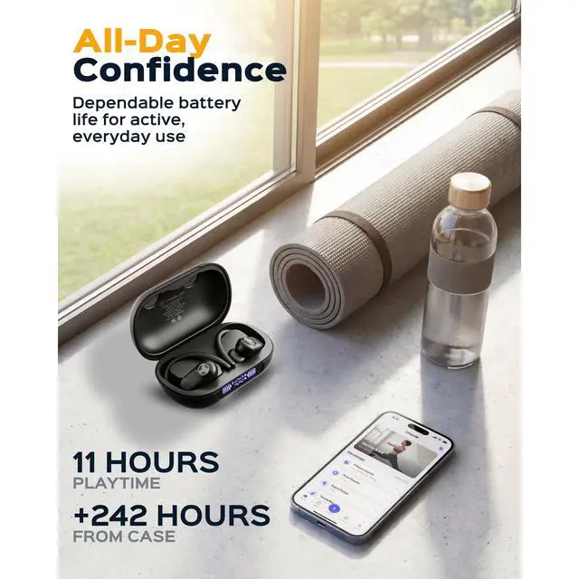 JAYSUING X4 are bluetooth earbuds over ear built for active performance, combining secure fit, long battery life, and stable wireless connectivity. These athletic earbuds wireless Bluetooth feature soft silicone ear hooks and 6 sizes of eartips, delivering a locked-in feel during movement. Designed as sports earbuds wireless bluetooth, they stay in place during running, gym workouts, and everyday activity ideal earbuds for running and workout earbuds that dont fall out. Powered by a high-capacity 2500mAh charging case, JAYSUING X4 are long battery life wireless earbuds offering up to 11 hours of playtime per charge and up to 242 additional hours from the case. USB-C charging enables fast recharging, while the case doubles as a portable powerbank, allowing you to charge your phone or other devices on the go a practical advantage for gym earbuds and outdoor use. Advanced Bluetooth 5.4 technology ensures low-latency audio and a stable connection up to 33 feet, making X4 reliable sport wireless earphones. Dual ENC microphones enhance voice clarity for calls, voice assistants, and virtual meetings, while passive noise isolation naturally reduces ambient sound supporting use as sports earbuds for focused training. Built for durability, JAYSUING X4 carry an IPX5 sweat-resistant rating, protecting against sweat and light rain. This makes them dependable sports earbuds wireless bluetooth for intense workouts, outdoor runs, and daily fitness routines. Whether used as workout headphones for men or workout headphones for women, they deliver comfort, stability, and consistent performance. With responsive physical controls, gaming mode, and broad device compatibility, JAYSUINGX4 function as versatile sport bluetooth earbuds for training, commuting, and everyday listening. Their secure over-ear design positions them as reliable over ear buds and bluetooth earbuds over ear for users who demand stability, endurance, and performance from their running earbuds and workout earbuds.