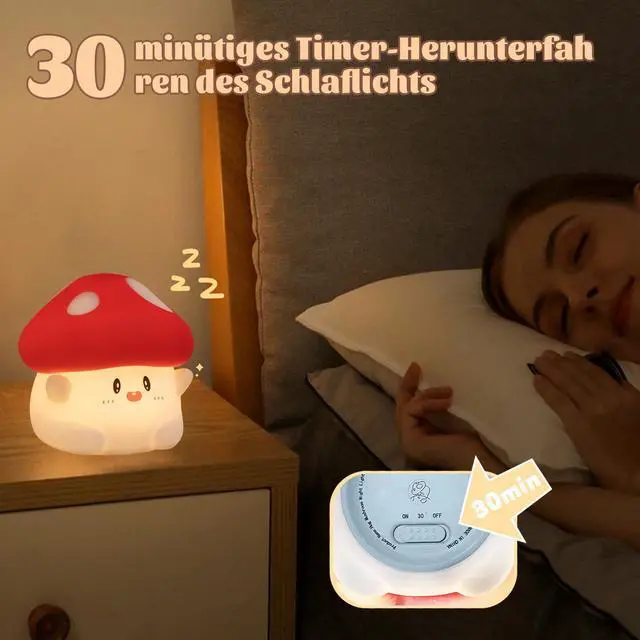 This Mushroom Night Light is a whimsical little gem that feels like plucked from a fairy-tale forest, blending charm with practicality to brighten your nights. Shaped like a chubby, vibrant mushroom with a soft silicone cap and stem, it perches on shelves or nightstands as if sprouted overnight, adding a touch of magical warmth to any space. A gentle tap on its squishy cap switches between two brightness levels: dim as moonlight filtering through fern fronds, perfect for lulling little ones to sleep, or bright as sunlight dappling through tree canopies, ideal for late-night snack runs or reading. Its battery is a quiet workhorseon low, it glows steadily for 52 hours, outlasting a week of bedtime routines; on high, it stays lit for 12 hours, enough to light up evening play or cozy chats. The 30-minute timer fades like a forest at dusk, dimming softly until it winks out, as if the mushroom is tucking you in with a silent goodnight. Recharge with the included cable, and its ready to glow againno messy batteries needed. More than a light, its a delightful companion: a hit with kids, a cute accent for nature lovers, and a tiny reminder that even the simplest things can feel like a sprinkle of magic.