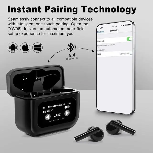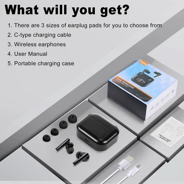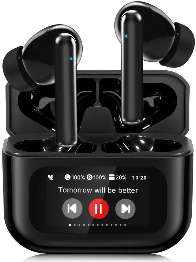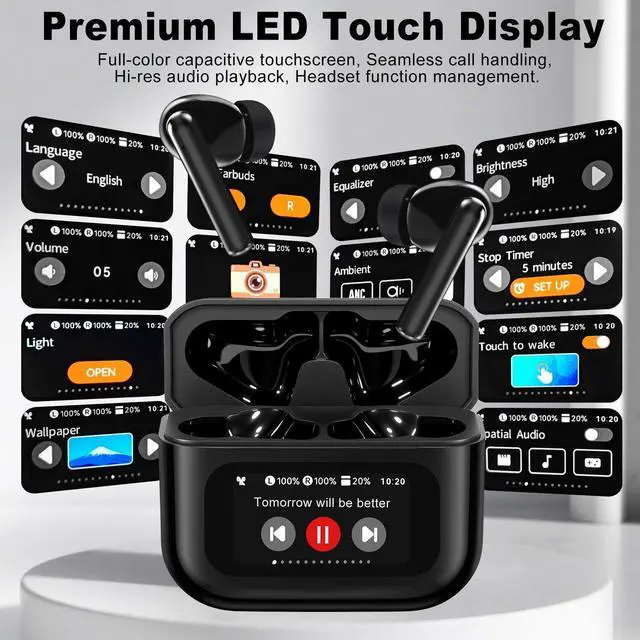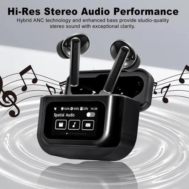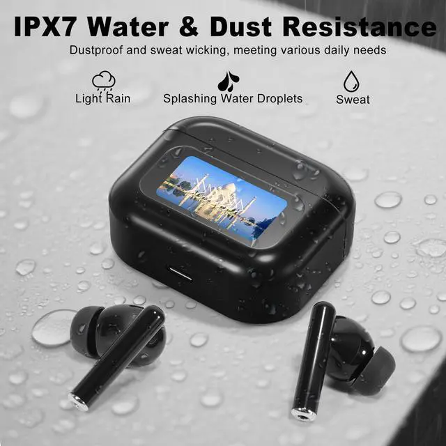 ANC Wireless Earbuds with Bluetooth 5.4, LED Touch Screen in Ear Bluetooth Earbuds, 40H Playtime Active Noise Cancelling Stereo Sound, IPX5 Waterproof Earphones, Fast Charging, for ios/Android Black Flip cover design: The flip cover design makes the headphone charging case smaller and easier to fit into a pocket or bag, making it convenient to carry around and avoiding clutter. Open the box cover to automatically turn on and connect the device. The magnetic flip cover design ensures stable storage of the earphones to prevent accidental dropping, while also preventing dust and dirt, extending the service life. In Ear Wireless Bluetooth Headphones: Includes a pair of Bluetooth headphones + charging compartment, 2 pairs of replaceable earbuds, 1 Type-C cable, 1 instruction manual.