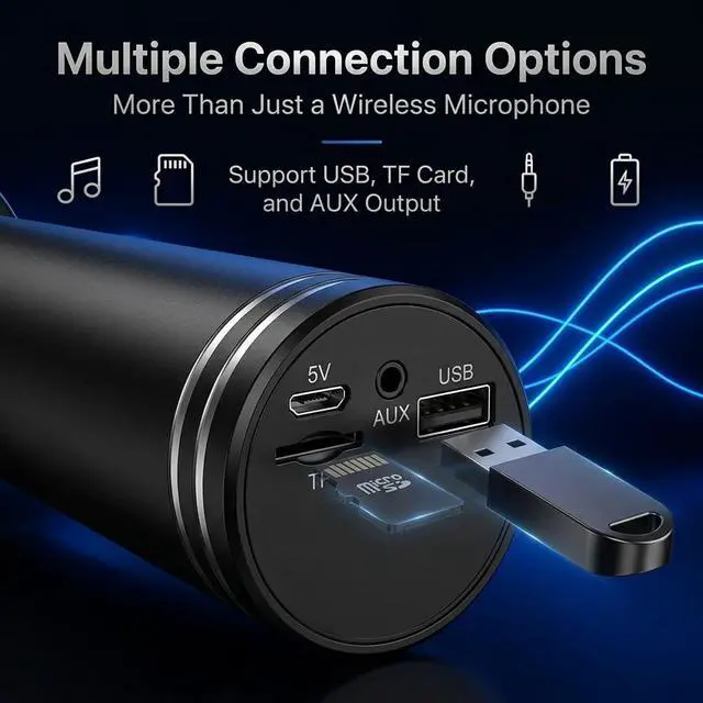 Universal Wireless & Wired ConnectivityEffortlessly pair with any Bluetooth-enabled smartphone, tablet, laptop, or smart device in seconds, supporting stable connections up to 33 feet away. For non-Bluetooth devices, simply use the included 3.5mm AUX cable to connect to your music player, or insert a TF card to play your favorite songs directly. The mic also supports voice recording, making it ideal for podcasting, vlogging, or sharing covers on social media.
