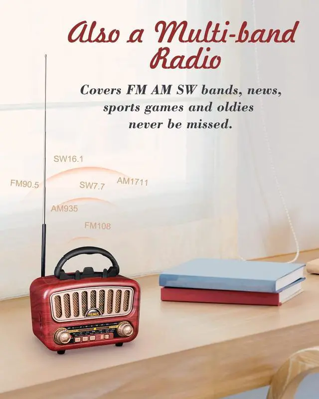 Thanks to its portable size and handle, the old-school speaker is so easy to carry anywhere with you. You'll always be accompanied by interesting news or moving songs while you're walking in the garden or fishing by the lake. With this little one, you'll never feel bored.
