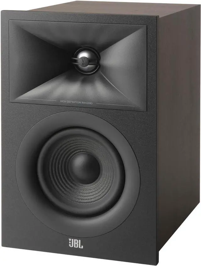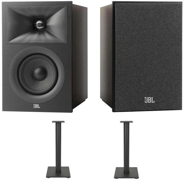 JBL STAGE-240B-BLK (Pair) - Bookshelf Loudspeaker - 4.5" Polycellulose Ribbed Cone Woofer - 1" Anodized Aluminum Tweeter - Next Gen HDI Waveguide - Precision 2-Way Crossover - 5-Way Binding Posts - Magnetically Attached Grilles - Rear-Firing Tuned Port - 2--125W Power - 53Hz - 24kHz Frequency - 85dB Sensitivity - 6ohms Impedance - 1.4 kHz Cross Over Frequency - Bass Reflex - Anti-Slip - Wall and 1/4-20 Insert Mounting Options - ( 6.9"W x 10.7"H x 8.5"D ) - (Black) with JBL STAGE-FS-BLK (Pair) - Floorstands - Designed for JBL Stage 240B/250B Bookshelf Speakers - Places the Tweeter at Optimum Height - Integrated Wire Management System - ( 3.1"W x 27.8"H x 6.3"D )