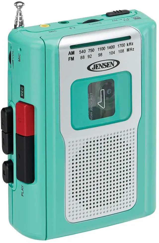 Jensen CR-100TE Teal Personal Cassette Player/Recorder is both portable and convenient. It also includes an AM/FM radio, so take it to the beach, the ball game, or anywhere else you want to listen to your favorite radio station, play old mix tapes, or audiobooks. Enjoy clear, static-free audio from the built-in speaker, and record from the radio or by using the built-in condenser microphone.