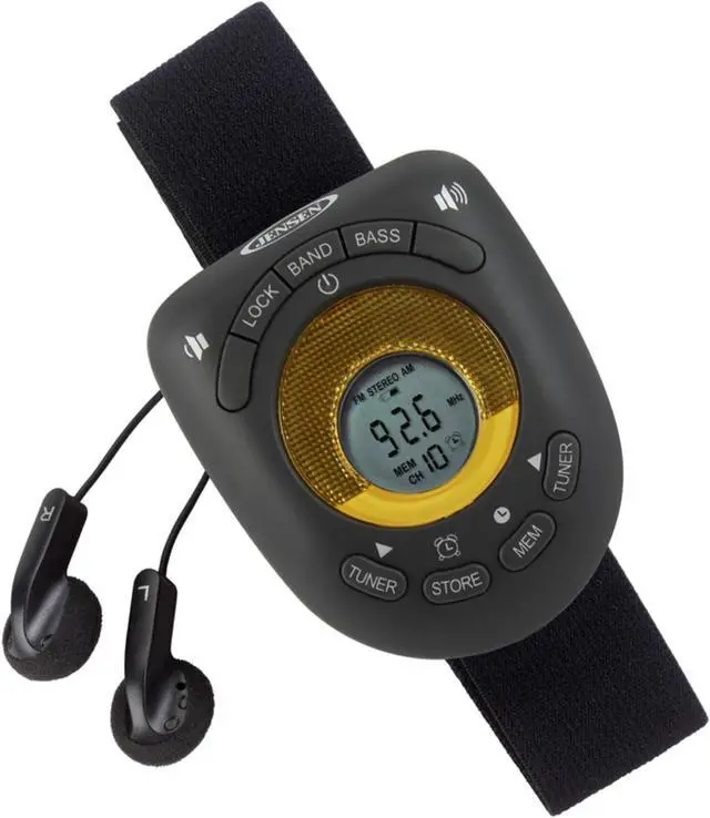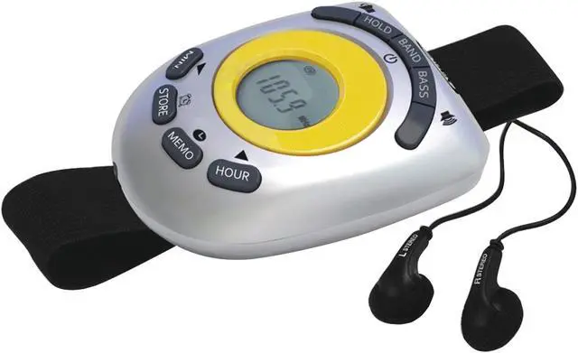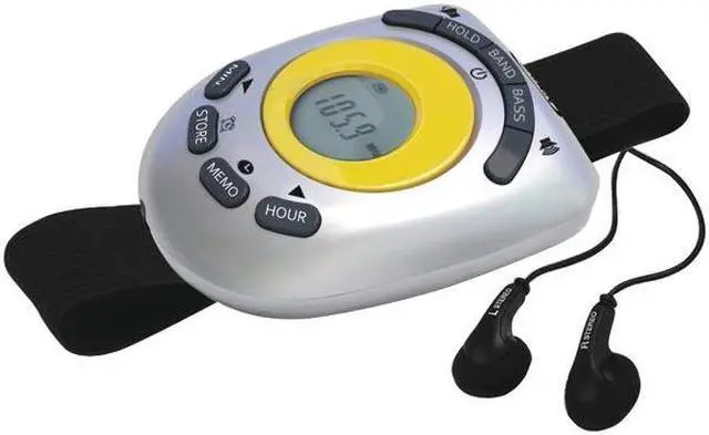 Arm yourself with music to go. Tote this sleek, small AM/FM radio in your pocket, use the built-in belt clip or wear it on your arm with the adjustable, nonslip elastic armband. However you carry it, prepare for full digital stereo sound from an AM/FM receiver with bass boost and 20 station presets. Includes a digital clock, stereo earbuds and a reflective safety ring.