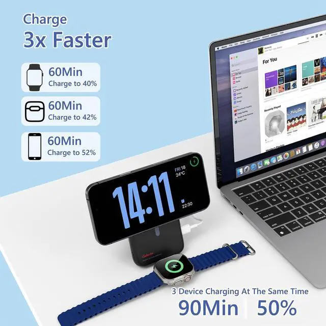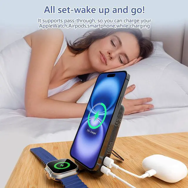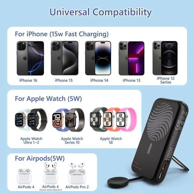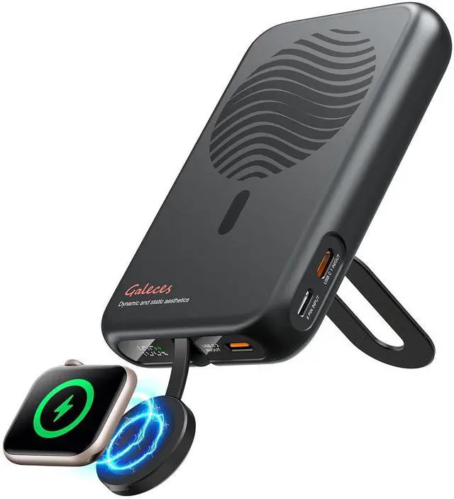Galeces 10000mAh Wireless Portable Charger Magnetic Power Bank for Magsafe USB C In&Out PD 20W Fast Charging Battery Pack for iPhone 16 Pro Max 15 14 13 12 iWatch i-Pad Series. A power bank with an LED digital display that accurately shows the remaining battery life and charging status. The 20W fast-charging magnetic power bank supports both wireless and wired charging, capable of charging four devices at once. With a capacity of 10,000mAh, it alleviates battery anxiety. It meets all international aviation transport standards, making it safe to carry on flights while traveling the world. Its compact size allows for easy one-handed use and fits comfortably in your pocket without taking up space. The sensitive and strong magnetic suction ensures effortless chargingsay goodbye to wired restrictions with this wireless power bank. 3-in-1 portable and foldable stand wireless power bank with 9.4 oz (0.58 pounds) lightweight and 4.6"*4.45"*1.1" size. You will get: Galeces 10,000mAh power bank for magsafe battery charger*1, USB-A to USB-C Cable*1, User Manual*1, Mesh Carrying Bag, 24 Months warranty, 24 Hours friendly customer service