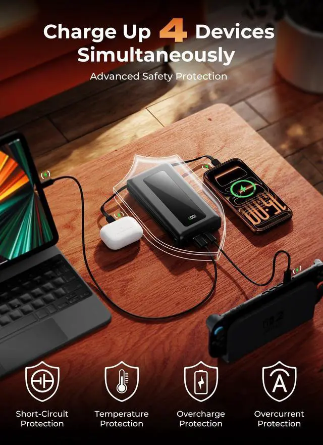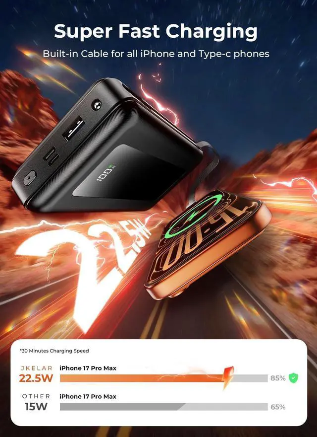 Portable Charger with Built in Cable: This portable charger power bank includes two built-in cables (iOS & USB-C) plus extra USB-A and USB-C ports, letting you charge up to four devices at once. It powers your iPhone, Samsung, iPad, drones, or handheld gaming consoles with ease. Perfect for sharing with friends, coworkers, or family during travel, commuting, road trips, or daily usean essential on-the-go charging solution