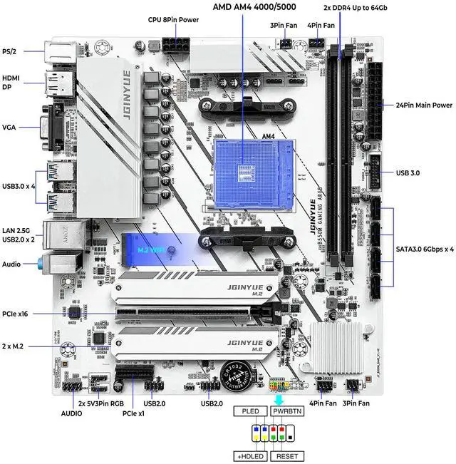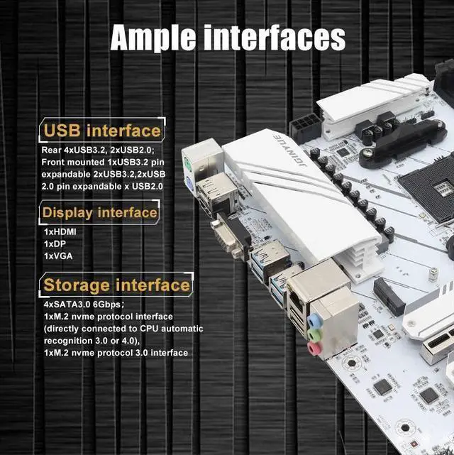Storage interface: 4xSATA3.0 6Gbps; 1xM.2 nvme protocol interface (directly connected to CPU automatic recognition 3.0 or 4.0), 1xM.2 nvme protocol 3.0 interface