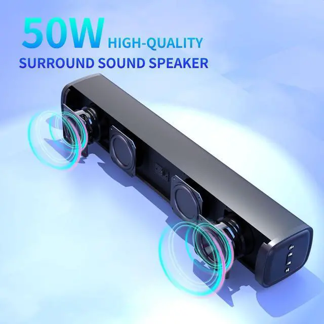 Our bluetooth sound bar has multiple connection options, including Bluetooth 5.3, Optical/AUX/RCA/USB, allowing you to connect it to smart TV, smartphones, PC, tablets or other devices, with efficient and stable transmission and strong anti-interference ability.