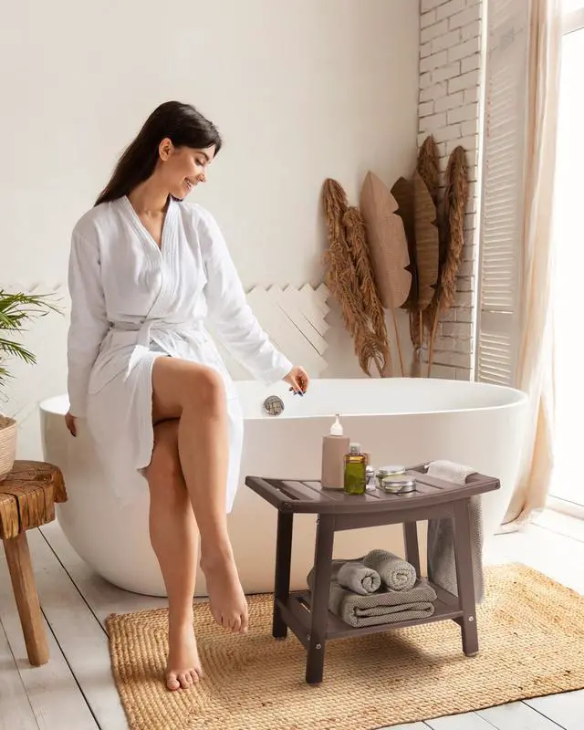 ERGONOMIC DESIGH: Our Shower Bench is carefully designed with ergonomic elements to provide stability and safety for an optimal bathing experience. The curved top shelf offers supportive and comfortable seating, ensuring a relaxing shower.