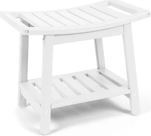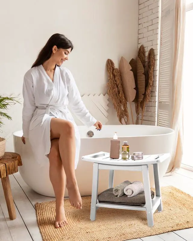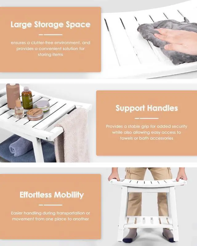 CONVENIENT FEATURES: This shower bench is equipped with sturdy handles that provide a secure grip and easy access to towels or bath accessories. The integrated storage shelf offers ample space to keep your bathing area tidy by storing towels, bath essentials, or shower accessories.