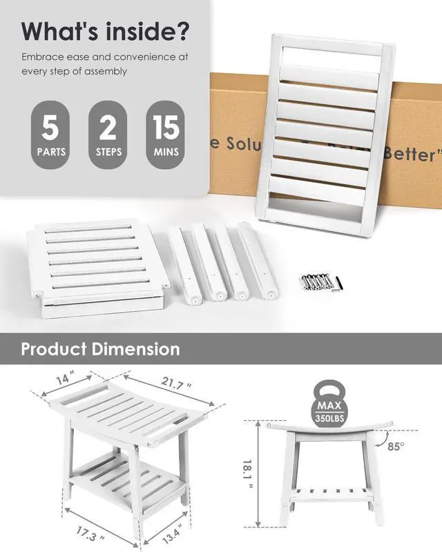 ERGONOMIC DESIGH: Our Shower Bench is carefully designed with ergonomic elements to provide stability and safety for an optimal bathing experience. The curved top shelf offers supportive and comfortable seating, ensuring a relaxing shower.