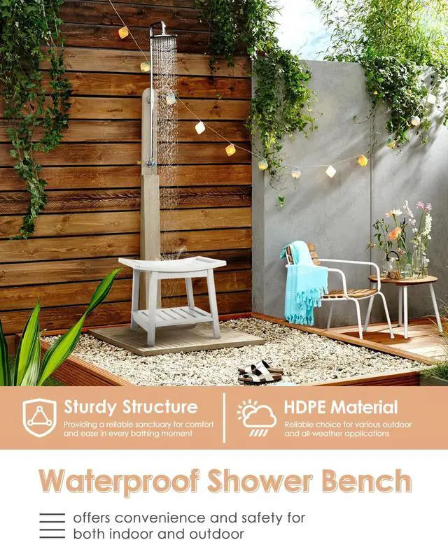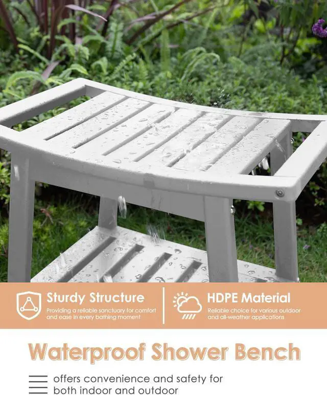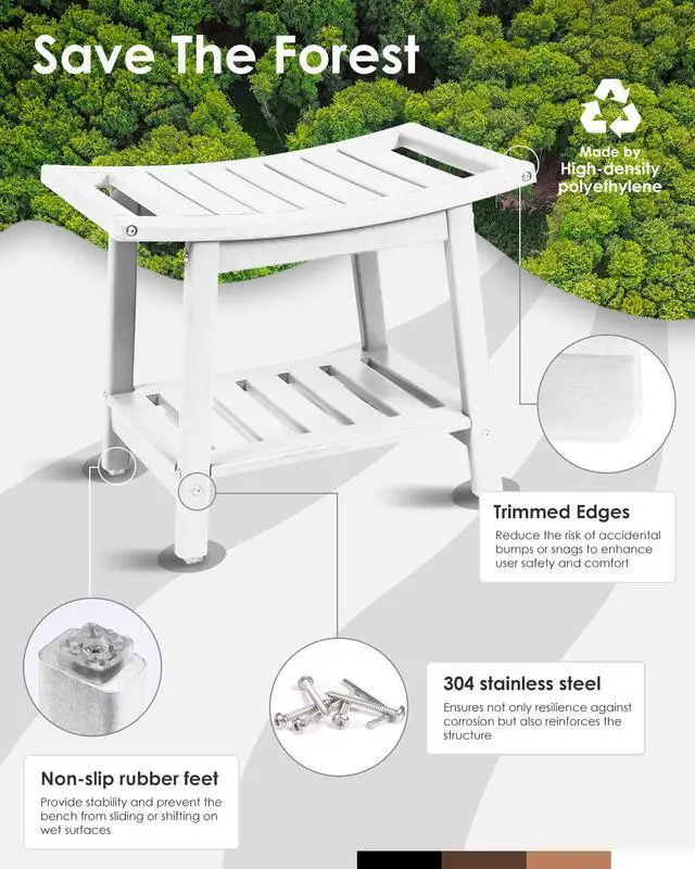 DURABILITY MATERIAL: Crafted from True High-Density Polyethylene (HDPE), the shower bench guarantees excellent water resistance and efficient water drainage through its slatted surface. Unlike bamboo or teak benches, it avoids issues like chipping, peeling, or rotting, making it a durable and low-maintenance choice.