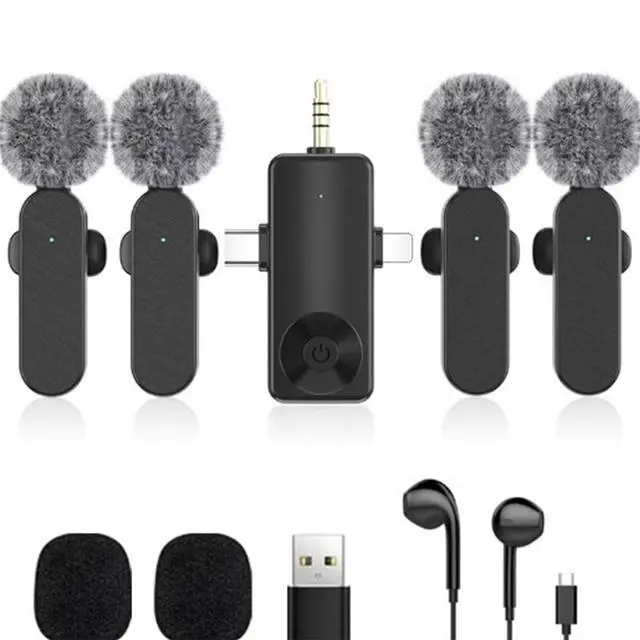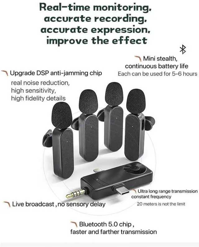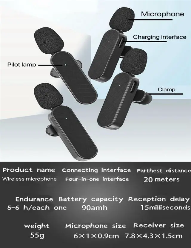 Product content: 3* microphone /4* microphone 1* receiver 1* earphone 1*USB adapter Battery capacity: 90amh Microphone size: 6X1X0.9CM Receiver size: 7.8X4.3X1.5CM Packing weight: 180g Package size: 21X11X5.5CM NOTICE: When trying, keep a distance of 4inches between each microphone, that is, simulate the normal use distance quadrate Pink and Black style packaging included 4* microphone 1* receiver 1* Monitor earphone 2*USB adapter Battery capacity: 160amh Microphone size: 3.5X3.5CM Receiver size: 4.5X2CM
