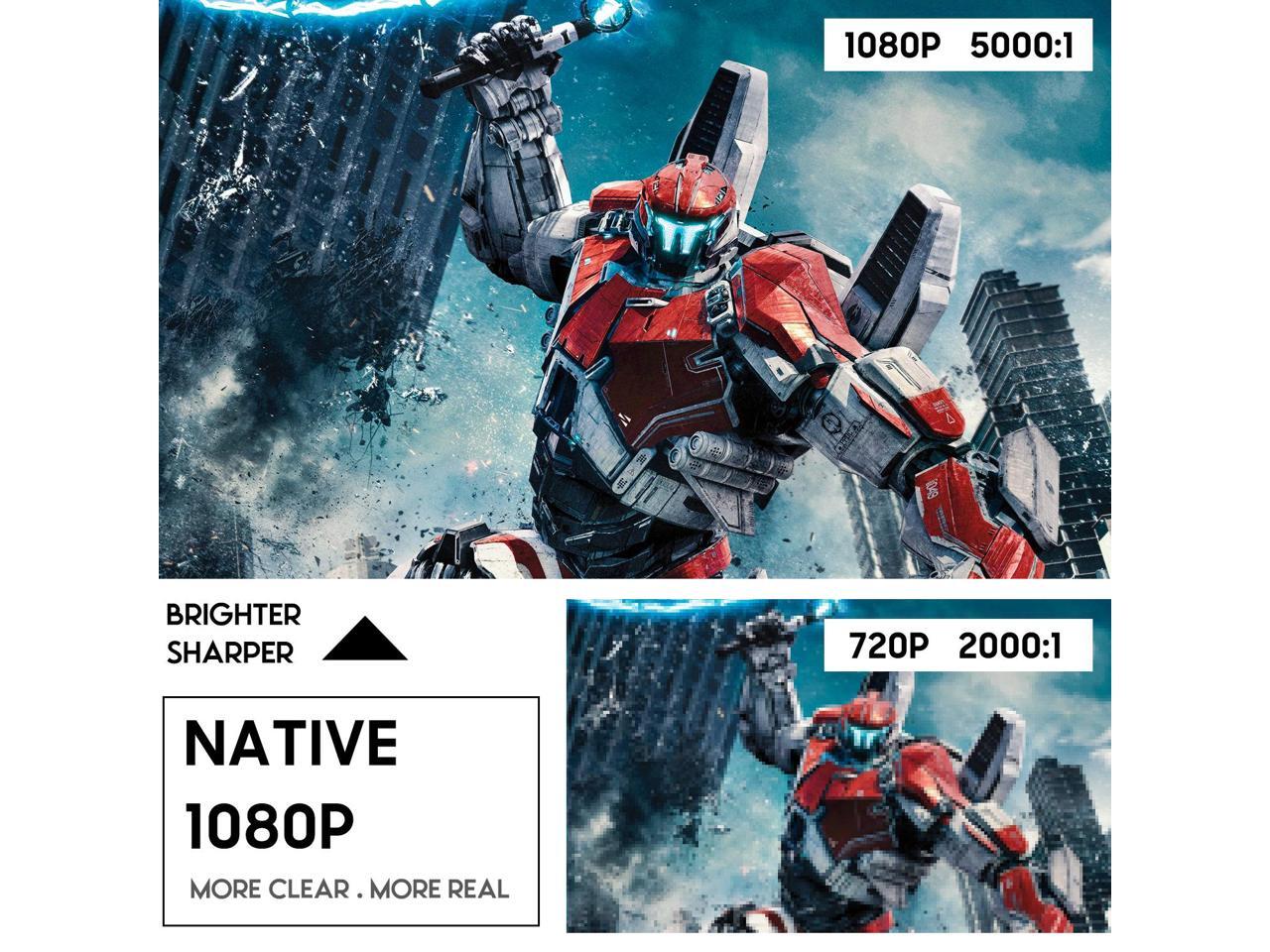 - [NATIVE RESOLUTION OF FULL HD 1920x1080] -With native resolution of 1920*1080 and contrast ratio of 5000:1, which is 3 times of more details than 720P projectors.Resolution support: 576i, 576p, 720i, 720p, 1080i, 1080p.