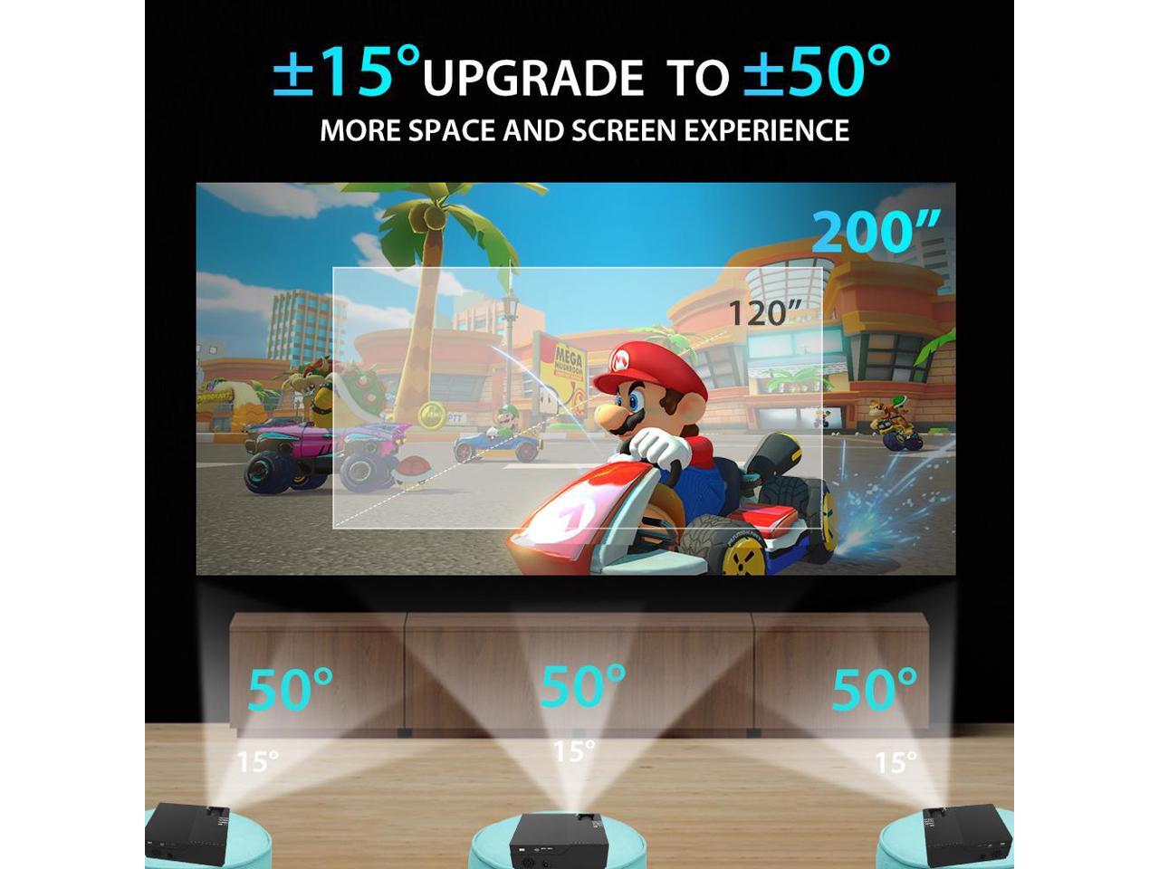 - [CONVENIENT UPGRADE And LOW POWER CONSUMPTION] - We have upgraded the electronic keystone correction from manual ±15° to electronic ±50°.M18 allows you to use a shorter distance to project a larger screen, and it can be placed in a corner.