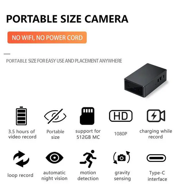 JINGRONGHUA Mini Camera , Home Security Camera , HD 1080P , Portable camera , HD 1080P , Indoor Cameras Nanny Cam , with Night Vision, Motion Detection, Loop Record, Gravity Sensor, 512GB Max, No-WiFi