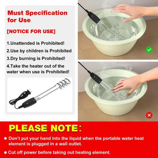 Don’t put your hand into the liquid when the portable water heat element is plugged in a wall outlet. Cut off power before taking out heating element.